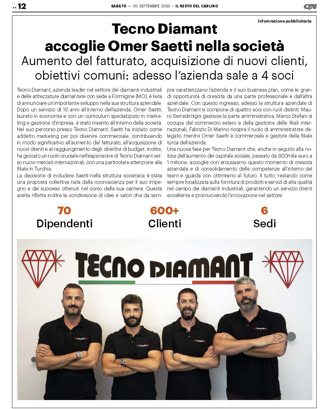 Nach 10-jähriger Tätigkeit im Unternehmen wurde Omer Saetti, der einen Abschluss in Wirtschaftswissenschaften und eine Spezialausbildung in Marketing und Unternehmensführung hat, in das Unternehmen aufgenommen. In seiner Laufbahn bei Tecno Diamant begann Saetti als Marketingbeauftragter und wurde dann zum Vertriebsmitarbeiter, wobei er wesentlich zur Umsatzsteigerung, zur Gewinnung neuer Kunden und zur Erreichung der Budgetziele beitrug. Er spielte auch eine entscheidende Rolle bei der Expansion von Tecno Diamant in neue internationale Märkte, mit besonderem Schwerpunkt auf der Tochtergesellschaft in der Türkei. Die Entscheidung, Saetti in die Unternehmensstruktur einzubeziehen, war ein kollektiver Vorschlag, der aus Dankbarkeit für sein Engagement und seine Leistungen im Laufe seiner Karriere entstand. Diese Wahl spiegelt auch die gemeinsamen Ideen und Werte wider, die das Unternehmen und seinen Geschäftsplan seit jeher prägen, wie z. B. die großartigen Möglichkeiten zur beruflichen und unternehmerischen Weiterentwicklung. Mit diesem Beitritt besteht die Unternehmensstruktur von Tecno Diamant nun aus vier Gesellschaftern mit unterschiedlichen Aufgaben: Mauro Serradimigni leitet die Verwaltung, Marco Stefani ist für den Außenhandel und die Leitung der internationalen Niederlassung zuständig, Fabrizio Di Marino ist Geschäftsführer und Omer Saetti ist Verkäufer und Leiter der türkischen Niederlassung des Unternehmens.
